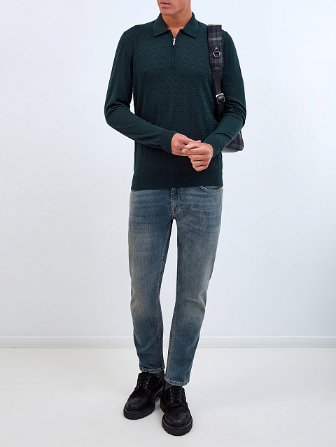 Джемпер от Bertolo создан вручную из премиальной шерсти и шелка в насыщенном темно-зеленом оттенке. Благодаря уникальным свойствам натуральных материалов модель поддерживает температуру тела на оптимальном уровне и сохраняет ощущение комфорта. Фактурный узор на передней планке вносит расслабленный штрих в повседневный образ. Детали: эластичная отделка кромок, отложной ворот-поло, застежка на молнию с брендированным пуллером. Сделано в Италии.
