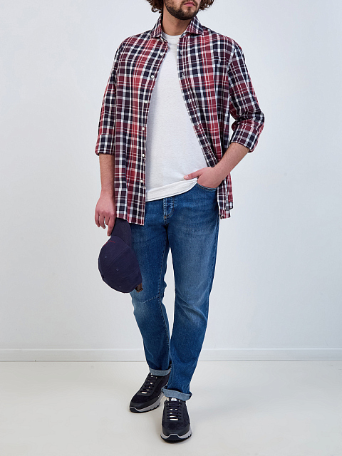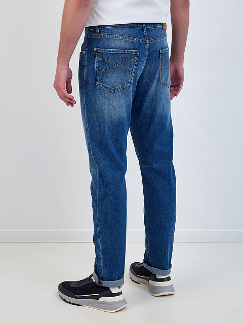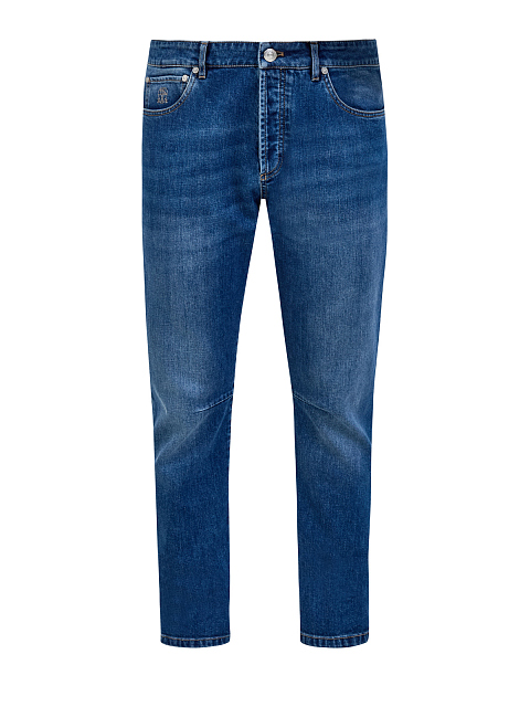 Мужские джинсы от Brunello Cucinelli выполнены из эластичного японского денима. Неоднородный оттенок с выбеленным эффектом придает образу расслабленное настроение, окрашивание в готовом виде выполнено мастерами бренда вручную и делает каждую пару уникальной. Контрастная прострочка швов подчеркивает линии кроя. Детали: застежка на пуговицы, вышитый логотип Соломео, нашивка из замши на поясе, пять карманов. Сделано в Италии.