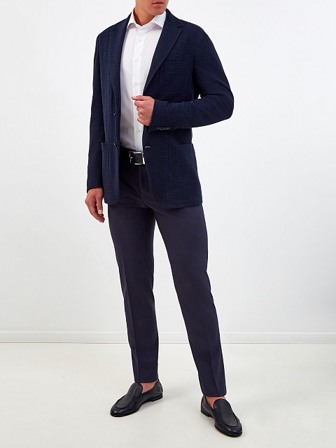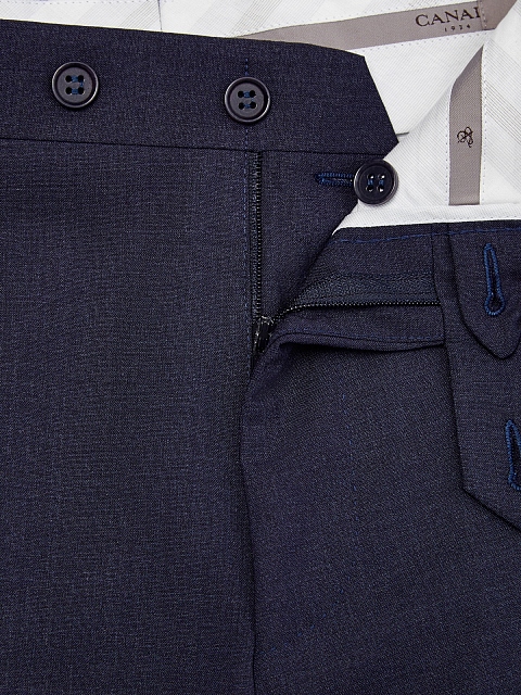 Классические брюки с заложенными складками от Canali. Модель в лаконичном темно-синем оттенке выполнена из шерстяной ткани Stretch — за счет эластичных волокон в составе материал подчеркивает строгие линии кроя и остается комфортным в движении. Детали: средняя посадка, прорезные карманы с бортами на спинке и диагональные карманы по бокам, асимметричная застежка на пуговицы и молнию. Сделано в Италии.