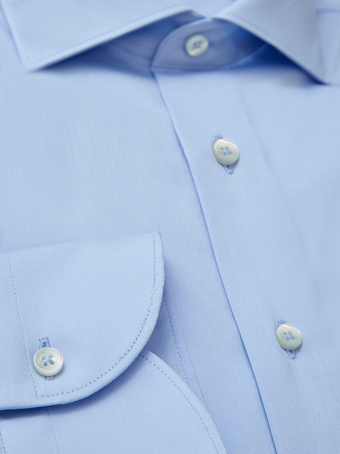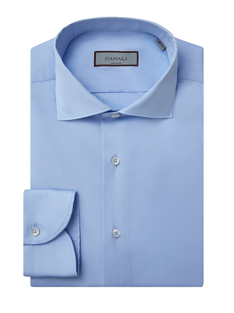 Однотонная голубая рубашка от Canali выполнена из эластичного хлопкового поплина — выверенный состав ткани обеспечивает комфорт в движении. Приталенный силуэт идеально подходит для создания торжественных, деловых и повседневных образов. Детали: закругленный нижний край, отложной воротник, застежка на пуговицы из перламутра. Сделано в Италии.