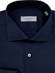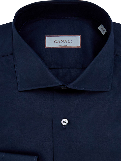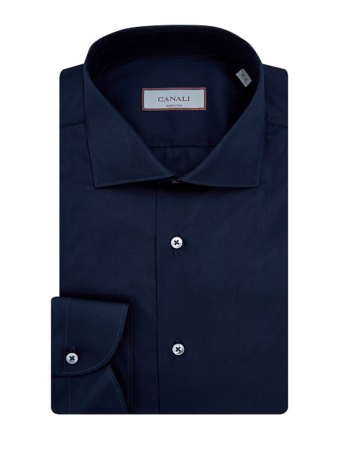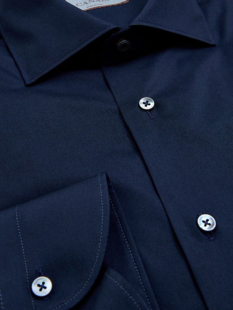 Однотонная рубашка в оттенке ночного неба от Canali выполнена из хлопкового поплина — выверенный состав ткани обеспечивает комфорт в движении, волокна эластана в составе предотвращают образование складок. Классический силуэт идеально подходит для создания деловых и повседневных образов. Детали: закругленный нижний край, отложной воротник «акула», застежка на пуговицы из перламутра, контрастная прострочка манжет. Сделано в Италии.