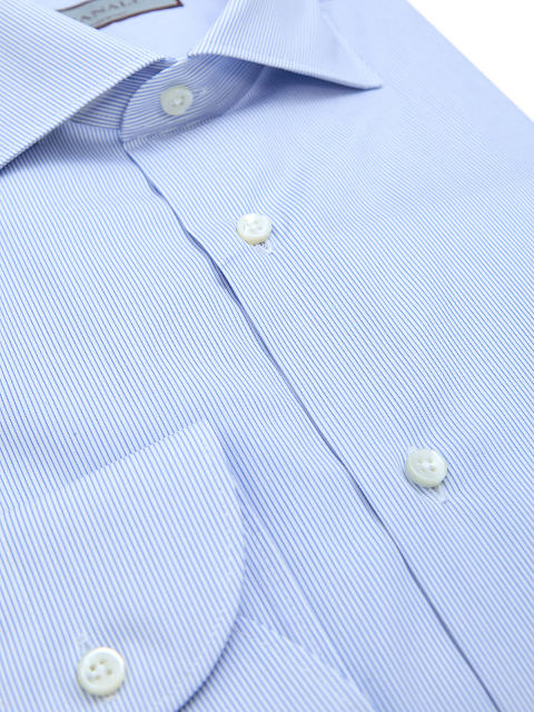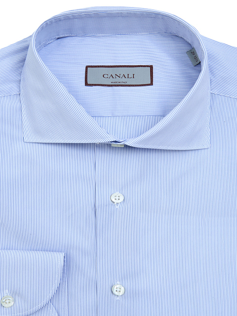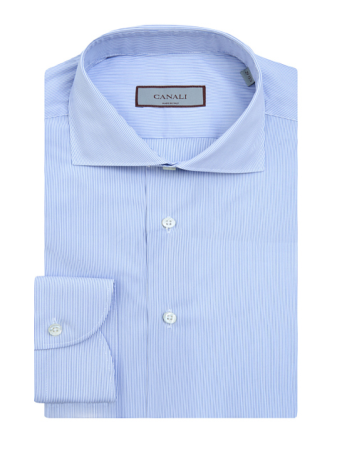 Рубашка из гладкого хлопка от Canali с принтом в тонкую вертикальную полоску выполнена в лаконичной бело-голубой гамме. Классический крой делает модель идеальным решением для создания комфортных аутфитов в рамках делового дресс-кода. Детали: отложной ворот, пуговицы из перламутра. Сделано в Италии.