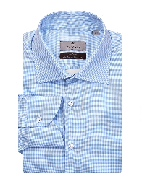 Элегантная мужская рубашка от Canali выполнена из гладкого египетского хлопка и натурального шелка. Ткань с характерным атласным блеском дополнена принтом в микро-клетку, который актуален для повседневных и деловых образов. Слегка приталенный крой с отложным воротником, рукавами на манжетах и застежкой на пуговицы из перламутра. Сделано в Италии.