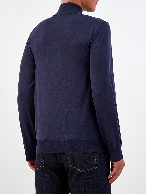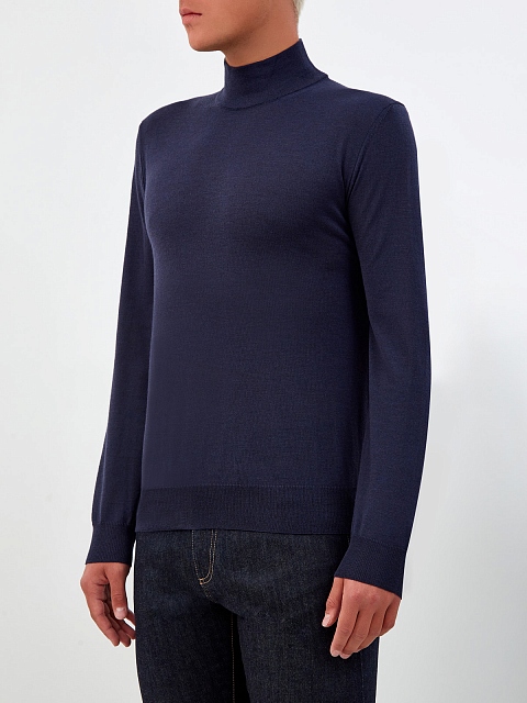 Мужская водолазка от Canali полностью выполнена из мягкой шерстяной пряжи в оттенке индиго. Техника чулочной вязки с плотным расположением петель и ценные свойства натурального материала делают модель действительно теплой несмотря на малый вес. Изделие кроя по фигуре дополнено эластичными манжетами и нижней кромкой в рубчик. Высокий ворот надежно защищает от ветра. Сделано в Италии.