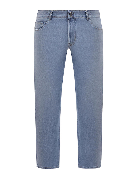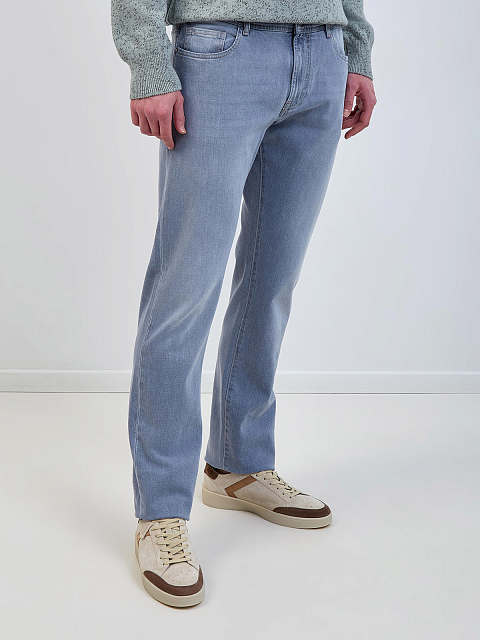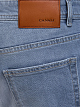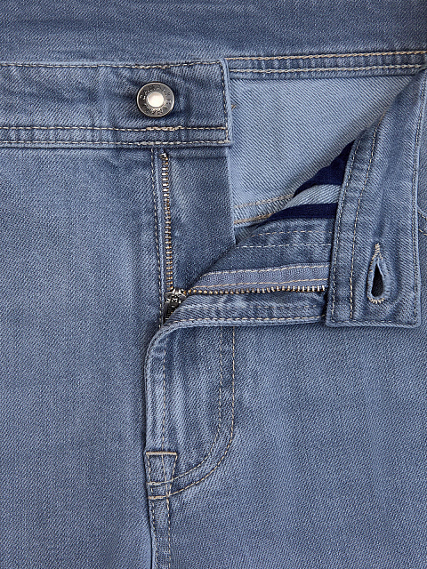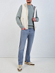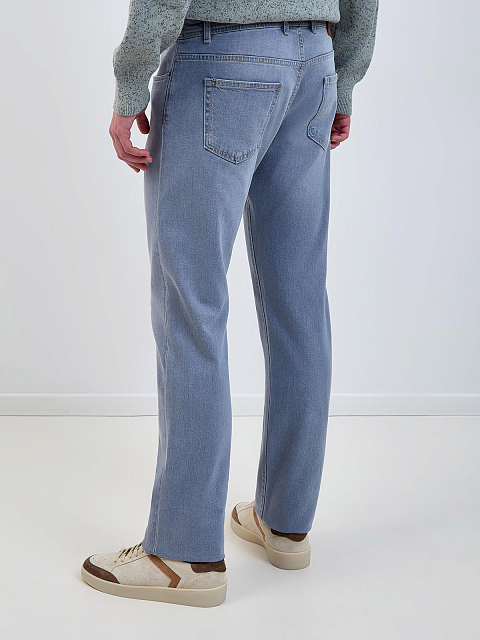 Джинсы с двухцветной прострочкой и нашивкой из кожи на поясе