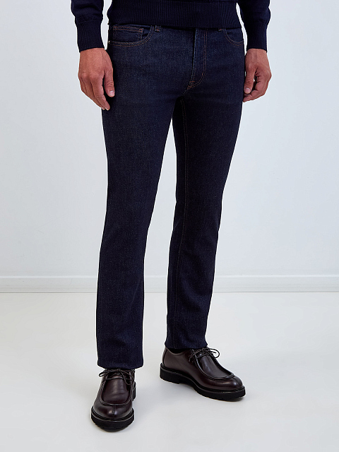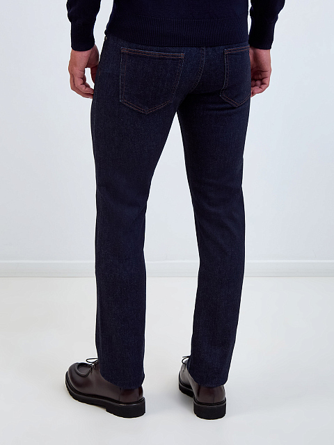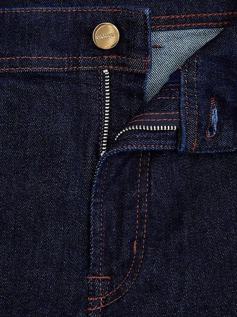 Джинсы от Canali выполнены из хлопкового денима — плотная эластичная ткань с добавлением благородных волокон кашемира делает модель идеальной основой для создания повседневных аутфитов. Темно-синий оттенок достигнут мастерами бренда вручную, расслабленный акцент в образ вносит контрастная прострочка швов и нашивка из кожи на поясе. Детали: пять карманов, застежка на молнию и пуговицу. Сделано в Италии.
