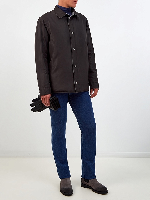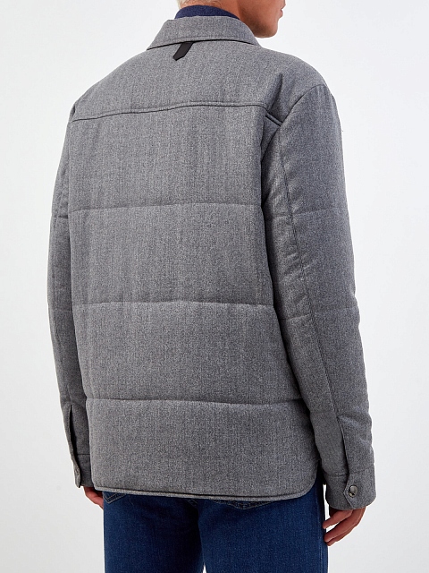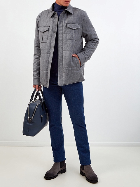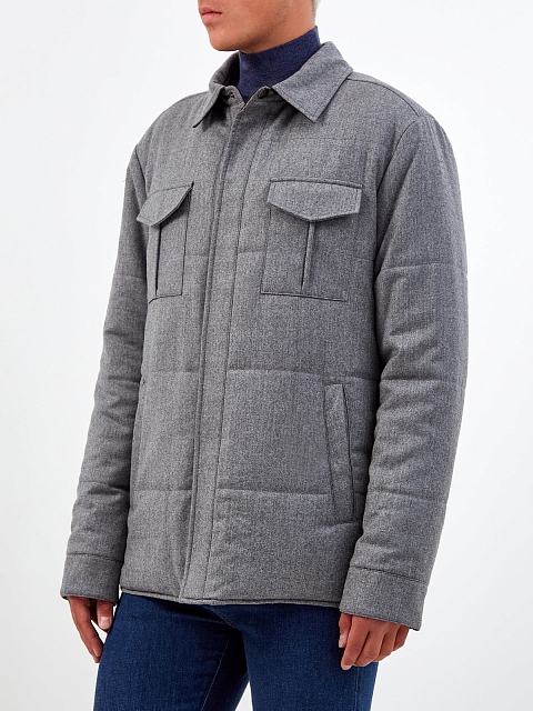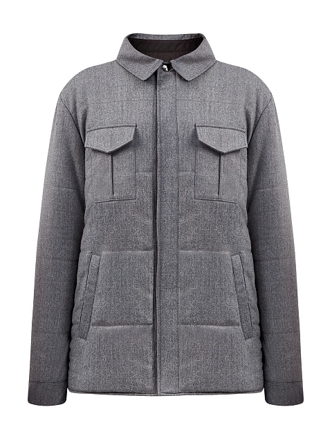 Двусторонняя мужская куртка от Canali характеризуется функциональным дизайном и технологичными материалами. Модель выполнена из плотной шерстяной фланели в меланжево-серой гамме с одной стороны, и из матового влагозащитного нейлона в черном цвете — с другой. Накладные и прорезные карманы, застежка на кнопки и отложной ворот завершают лаконичный дизайн. Сделано в Италии.
