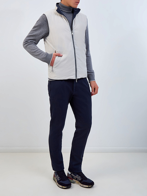 Двусторонний мужской жилет от Eleventy идеально подходит для создания многослойных образов. Модель создана из бархатистого хлопкового вельвета с одной стороны, и из матового влагозащитного нейлона — с другой. Стеганая отделка распределяет невесомый наполнитель из гусиного пуха и пера, не допуская переохлаждения или перегрева. Детали: прорезные карманы, застежка на молнию с двойным брендированным пуллером.