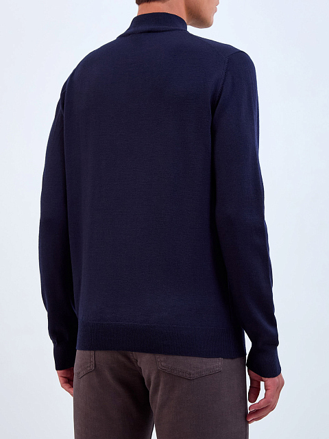 Мужская водолазка от Gran Sasso полностью выполнена из мягкой шерстяной пряжи в глубоком оттенке индиго. Техника чулочной вязки и ценные свойства натурального материала делают модель теплой, и при этом легкой. Изделие кроя по фигуре дополнено эластичными манжетами и нижней кромкой в английскую резинку. Высокий ворот надежно защищает от ветра.