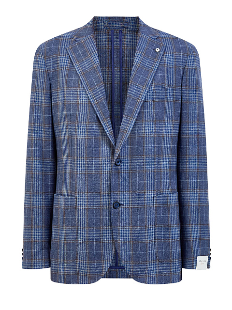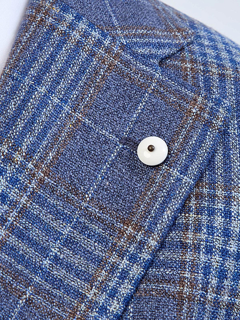 Мужской пиджак от L.B.M. 1911 создан из фактурной ткани на основе шелка и шерсти с узором в клетку, который делает образ стильным и многогранным. Модель выполнена в лучших традициях неаполитанской школы, о чем говорят мягкая линия плеча и отсутствие подкладки, а также силуэт с вытачками и шлицами на спинке, которые обеспечивают посадку по фигуре. Лацканы английского ворота украшены изящной брошью — фирменным символом бренда. Детали: накладные карманы с закругленными линиями, застежка на две пуговицы, потайной карман. Сделано в Италии.