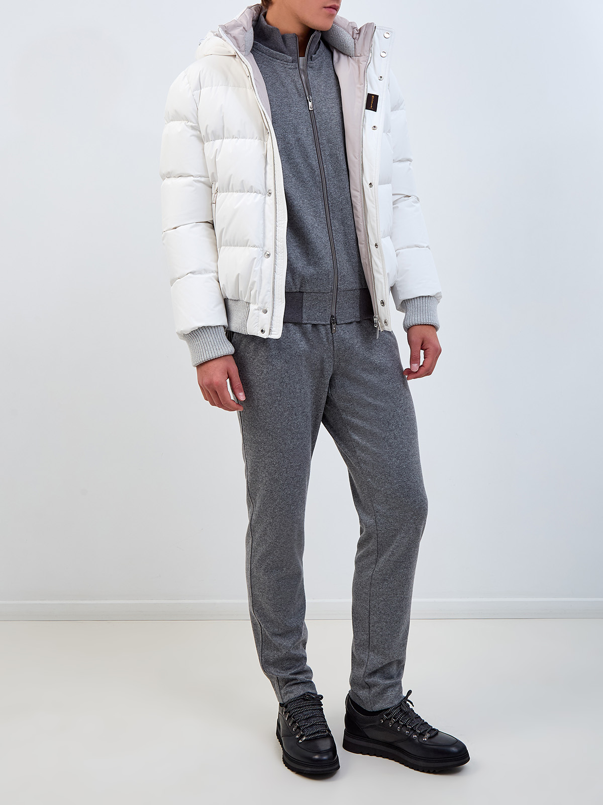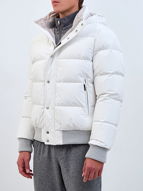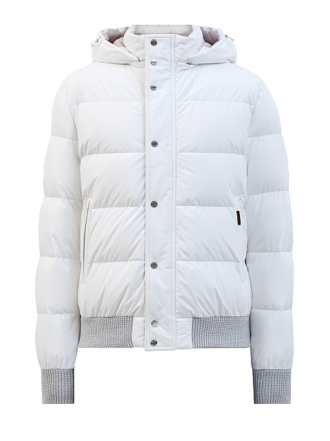 Пуховик-бомбер от Moorer выполнен из непромокаемого и ветрозащитного нейлона Acqua Proof с горизонтальной стежкой, набивка из гусиного пуха сохраняет комфорт в условиях низких температур. Манжеты и нижняя кромка в технике эластичной английской вязки не позволяют холодному воздуху проникать внутрь. Съемный капюшон на молнии завершает функциональный дизайн. Детали: прорезные карманы, двойная линия застежки на молнию и кнопки.