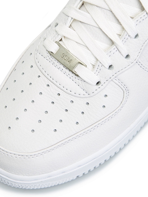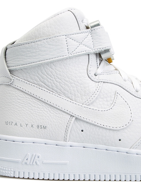 Кроссовки Nike Air Force 1 High Triple White созданы в коллаборации с дизайнером Мэтью Уильямсом и его брендом 1017 Alyx 9SM. Модель представляет классический силуэт высоких Air Force 1982 года, переосмысленный в агрессивно элегантном стиле Уильямса. Основная часть пары выполнена из премиальной зернистой кожи в кремовом оттенке с перфорациями на носке и по бокам. Кожа также используется во внутренней отделке и на язычке. Логотип Alyx напечатан на пятке, а на пряжке для шнурков и эглетах появляются надписи 1017 и 9SM — дата рождения и адрес первой студии Уильямса. Минималистичный дизайн модели акцентирует знаковый элемент Alyx — алюминиевую пряжку, вдохновленную ремнями безопасности на американских горках.