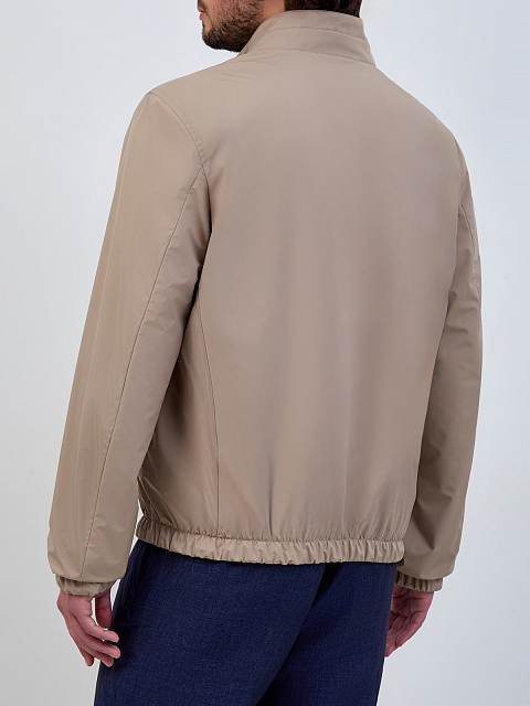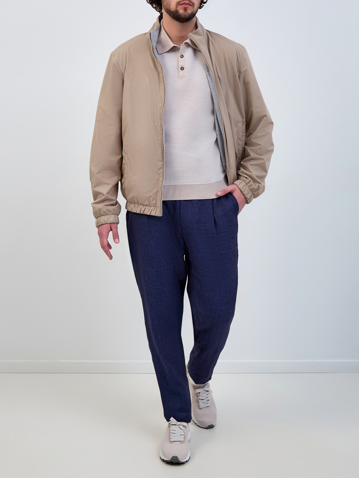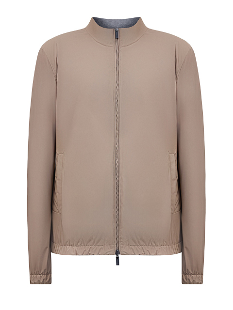 Двусторонняя куртка от Peserico характеризуется лаконичным дизайном и технологичными материалами. Модель выполнена из матового влаго- и ветрозащитного нейлона в бежевом цвете с одной стороны, и из мягкого трикотажа в меланжево-сером оттенке — с другой. Прорезные карманы с бортами, эластичные манжеты и нижний край, а также застежка на молнию с двойным брендированным пуллером завершают функциональный дизайн. Сделано в Италии.