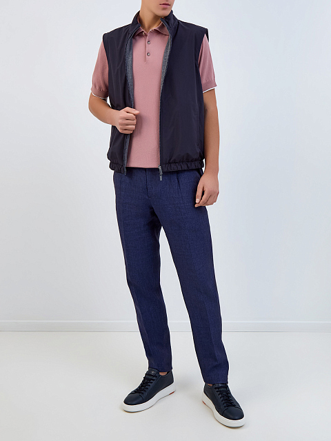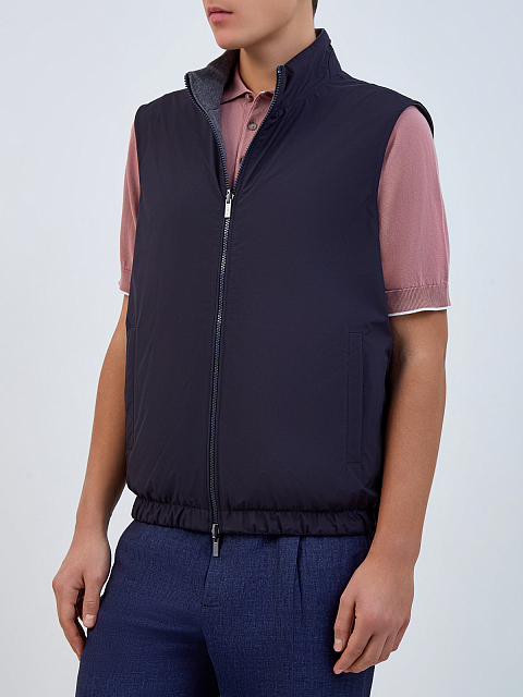Двусторонний мужской жилет от Peserico выполнен из влагозащитного матового нейлона Loro Piana. Мягкая хлопковая отделка и тонкий утепляющий слой делают модель универсальным элементом для составления многослойных образов. Детали: эластичный нижний край, прорезные карманы, застежка на молнию с двойным брендированным пуллером. Сделано в Италии.