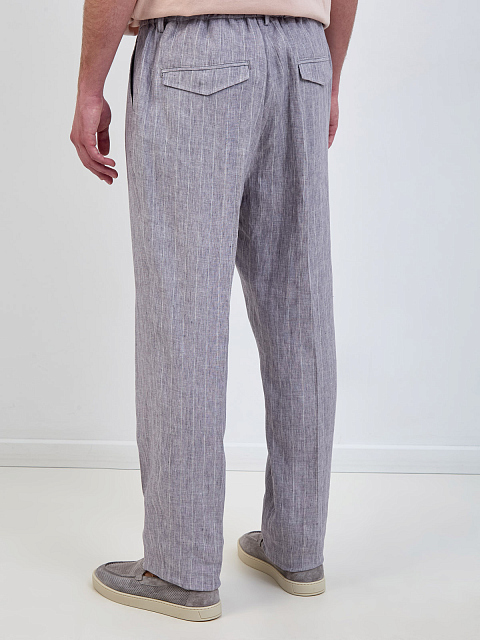 Льняные брюки в тонкую полоску с защипами и поясом на кулиске