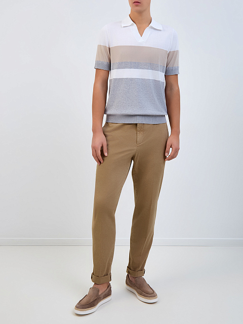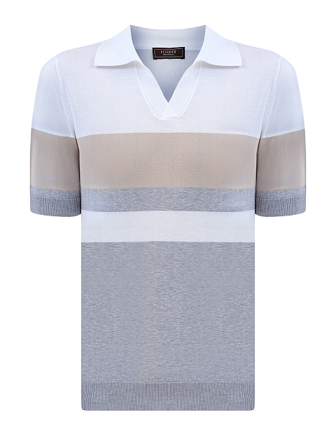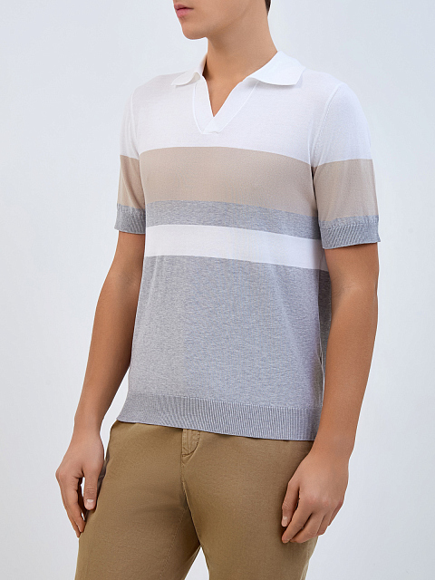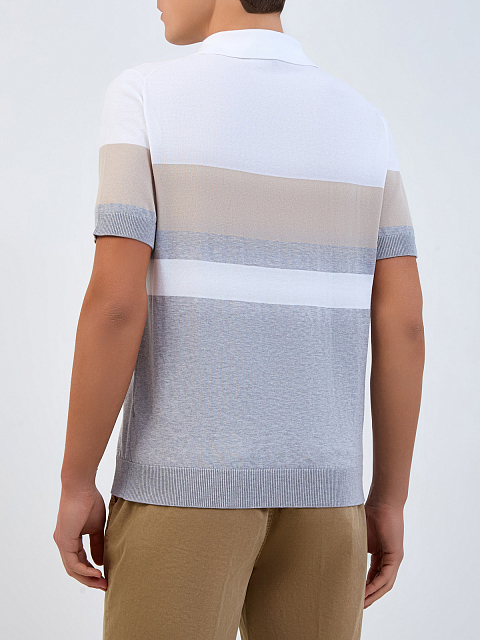 Мужской джемпер-поло с короткими рукавами от Peserico. Легкая и мягкая хлопковая пряжа идеально подходит для летнего сезона. Слегка облегающий крой не стесняет движений, а эластичная отделка кромок обеспечивает посадку по фигуре. Модель в стиле colorblock сочетает натуральные песочные, белые и меланжево-серые тона. Сделано в Италии.