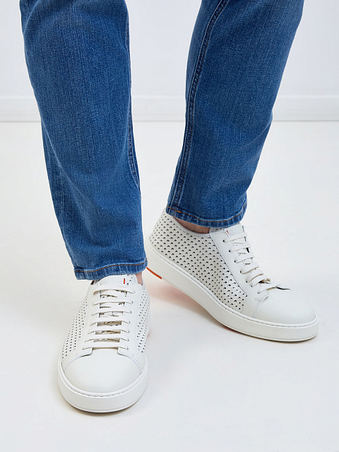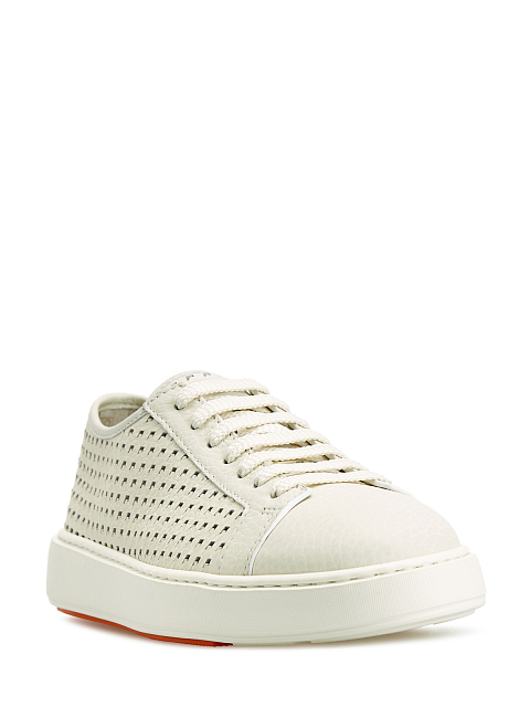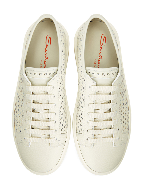 Однотонные мужские кеды-carryover от Santoni выполнены из мягкой крупнозернистой кожи в кремовом оттенке. Особенностью модели стала перфорация в лазерной технике, литая подошва обеспечивает максимальный комфорт в движении. Детали: противоскользящий протектор, внутренняя кожаная отделка, шнуровка в тон. Сделано в Италии.