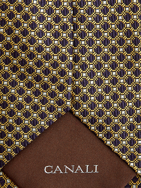 Стильный галстук ручной работы от Canali. Вышитый принт в жаккардовой технике создает дополнительные варианты цветовых сочетаний в образе. Для производства аксессуара используют только цельные отрезы шелка — это помогает добиться четкой фактуры, которая с легкостью образует любой необходимый узел. Сделано в Италии.