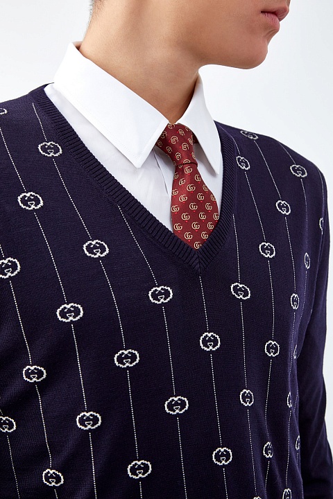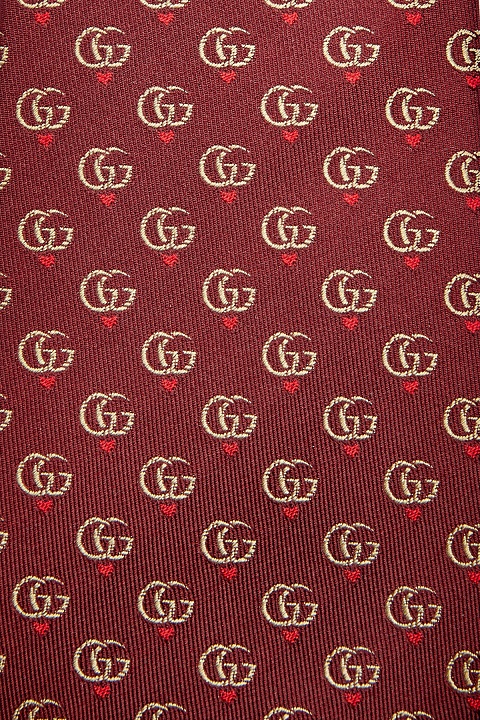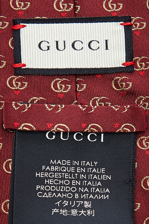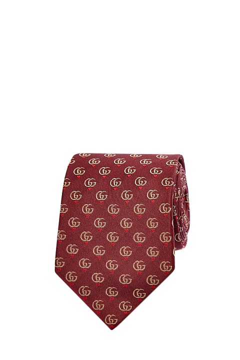 Узкий галстук от Gucci выполнен из атласного шелка в оттенке ягодного вина. Плотный материал легко образует узел любой сложности. Культовый принт Double G дополнен паттерном в виде сердец, который отражает романтическую грань концепции Модного дома. Ширина аксессуара 7 см. Сделано в Италии.