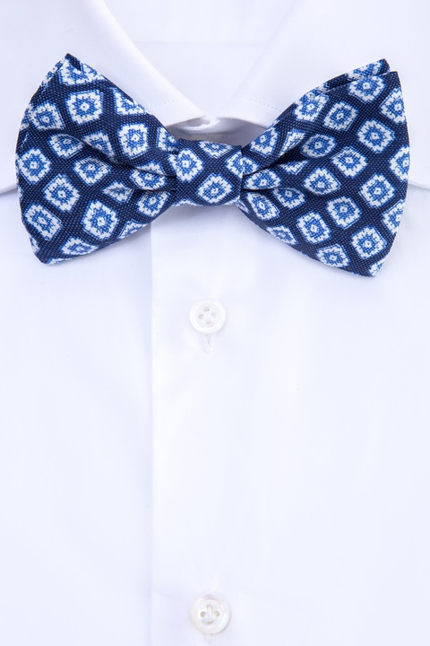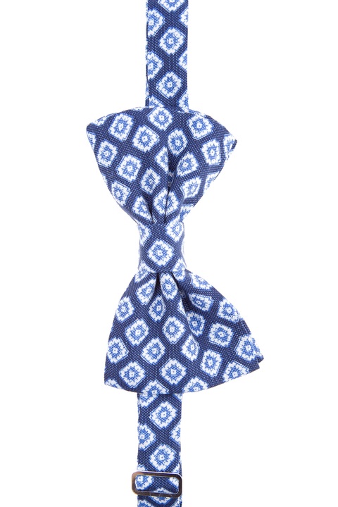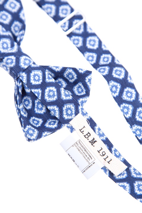 Элегантный классический галстук-бабочка L.B.M. 1911 для мужчин. Модель выполнена из волокон натуральных хлопка и льна с жаккардовым переплетением, образующих неравномерную поверхность синего цвета со светлым геометрическим узором. На шейном ремешке имеется нашивка с названием бренда и металлический слайдер для регулировки по размеру. Застежка осуществляется на петельку и крючок. Сделано в Италии.