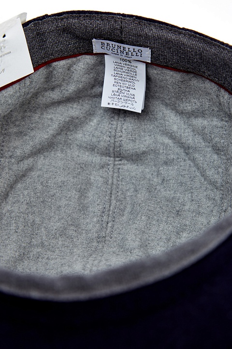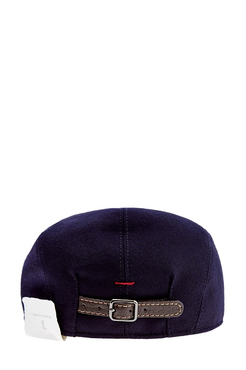Кепка-коппола от Brunello Cucinelli из шерстяной фланели в оттенке «ультрамарин» с пич-эффектом и мягкой хлопковой подкладкой. Кожаный ремешок с металлическим фиксатором позволяет регулировать плотность посадки. Текстильная лента внутренней подкладки в цвете «бордо» является отличительной особенностью бренда. Сделано в Италии.
