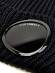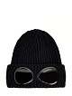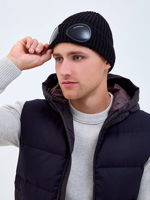 Стильная мужская шапка в оттенке ночного неба от C.P. Company. Модель из мягкой пряжи на основе ценных волокон шерсти надежно защищает от холодного воздуха. Аксессуар в технике эластичной вязки трансформируется благодаря широкому отвороту с защитными очками-линзами Goggles.
