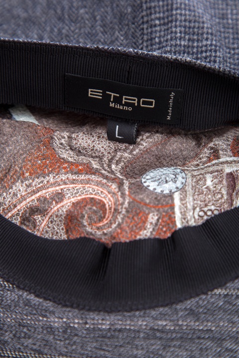 Элегантная мужская кепка-коппола бренда Etro выполнена в технике пэчворк из мягкой шерстяной фланели и хлопка. Аксессуар создан в классическом сером оттенке с традиционными узорами: елочка, гусиная лапка и полоска. Внутренняя поверхность на подкладке в фирменном стиле с этническими орнаментами. Сделано в Италии.