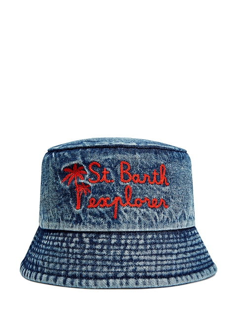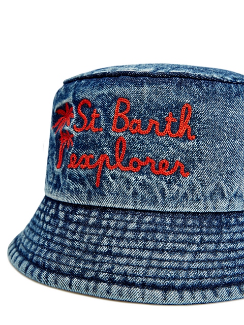 Мужская шляпа в стиле сафари от MC2 Saint Barth выполнена из держащего форму хлопкового денима с эффектом кислотной стирки. Фирменный штрих — вышитый принт-леттеринг. Небольшие простроченные поля защищают от прямых солнечных лучей.