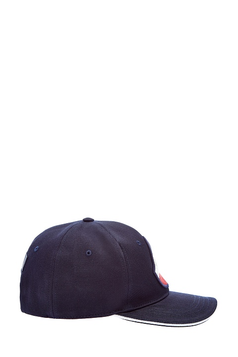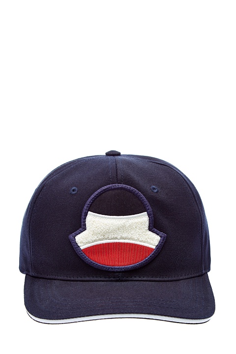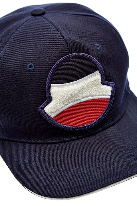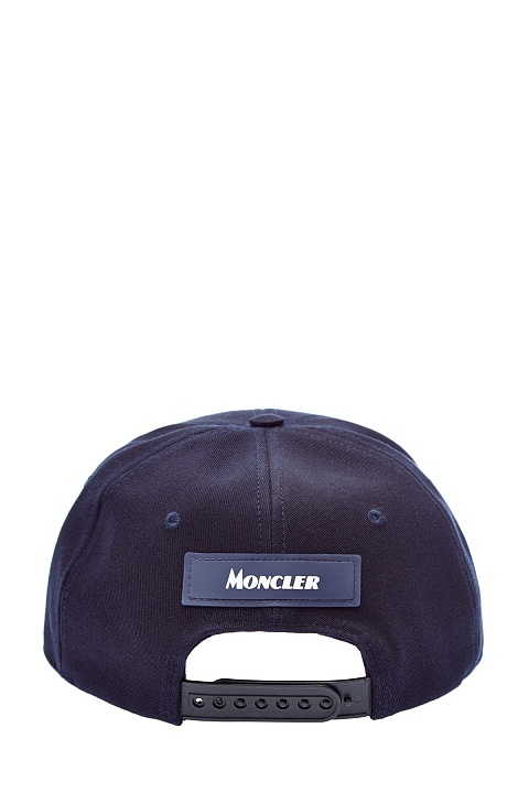 Темно-синяя бейсболка от Moncler из хлопкового габардина с диагональным переплетением волокон. Дышащий натуральный материал — оптимальное решение для солнечных дней в летний сезон. Аксессуар дополнен аппликацией в виде символики бренда, который создан в фактурной петлевой технике. Детали: логотип из силикона, лента для индивидуальной регулировки по полноте.
