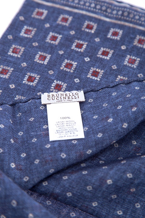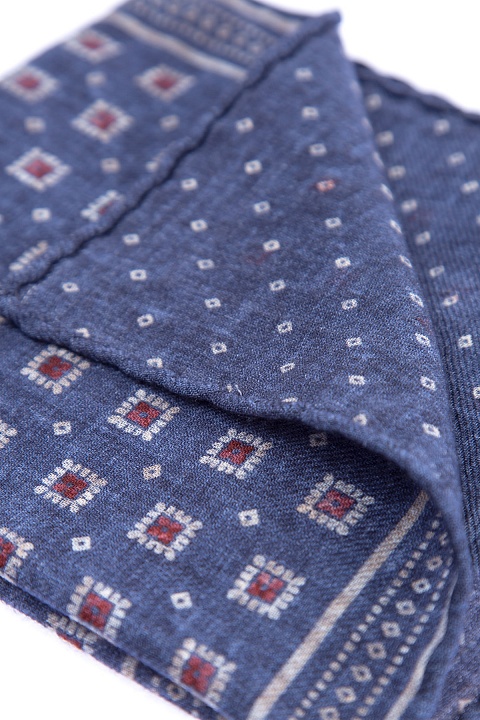 Лаконичный мужской карманный платок-паше из весенне-летней коллекции Brunello Cucinelli выполнен из тончайшей шерстяной ткани в глубоких тонах кобальтово-синего цвета. Поверхность декорирована геометрическим узором с флористическими мотивами в брусничной гамме. Изнаночная сторона с контрастным принтом завершает изделие. Кромки закрыты объемным швом. Параметры: 35×35 см. Сделано в Италии.