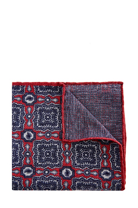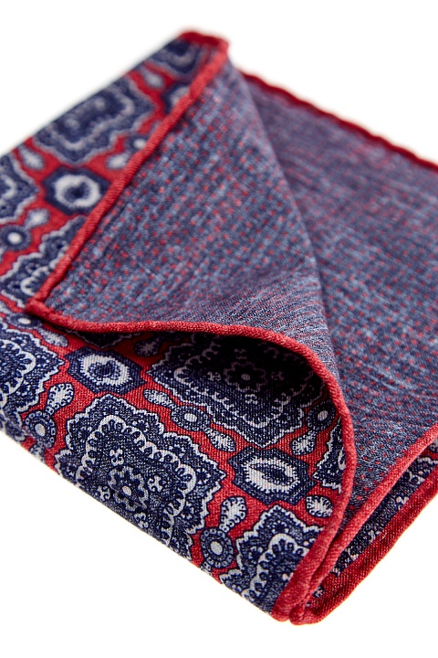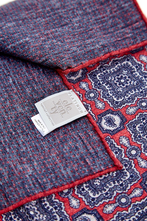 Мужской платок-паше от Eleventy выполнен из ткани на основе волокон шерсти и хлопка. Благодаря своим свойствам ткань хорошо драпируется и держит форму. Аксессуар в брусничном оттенке украшен принтом в точку с одной стороны и этническим орнаментом- с другой. Кромки закрыты объемным выполненным вручную швом. Размеры 35×35 см. Сделано в Италии.