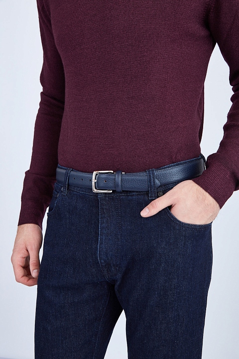 Двусторонний мужской ремень Etro из мягкой и гибкой телячьей кожи с матовой поверхностью глубокого синего цвета с одной стороны и темно-вишневого с другой. Модель характеризуется минималистичным дизайном и дополнена классической металлической пряжкой в серебряных тонах. Ширина 3 см. Сделано в Италии.