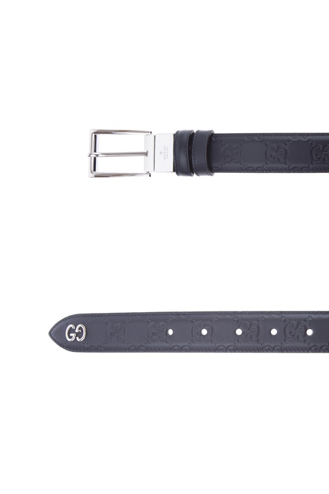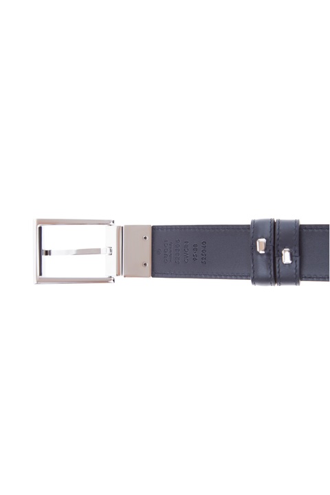 Двусторонний мужской ремень Gucci выполнен из гладкой телячьей кожи глубокого синего цвета с фирменным тиснением по всему полотну и гладкой поверхностью с обратной стороны. Модель характеризуется классической пряжкой из глянцевого металла и заостренным кончиком с эмблемой бренда. Ширина 3 см. Сделано в Италии.