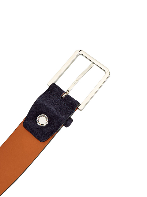 Стильный мужской ремень в оттенке индиго от Santoni выполнен из бархатистой замши. Традиционная прямоугольная пряжка дополнена литой отделкой, гладкая внутренняя поверхность создана в фирменном оранжевом цвете. Логотип бренда в технике тиснения завершает минималистичный дизайн. Детали: фурнитура с серебристым напылением, прострочка кромок в тон. Сделано в Италии.