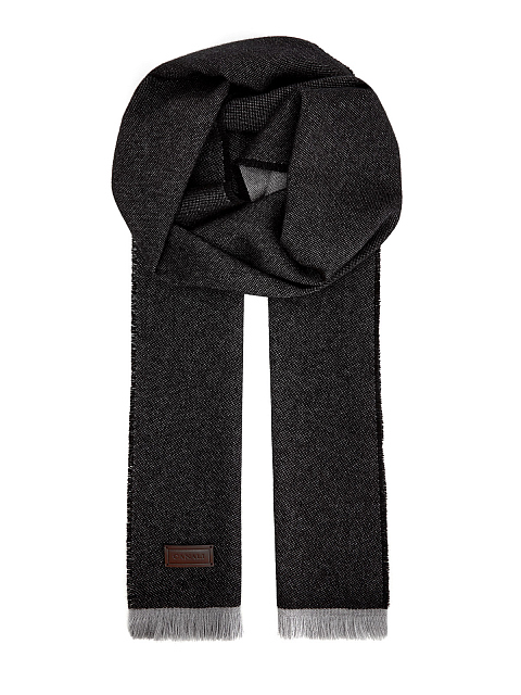 Лаконичный мужской шарф от Canali выполнен из ценных волокон шерсти и кашемира в меланжево-серой гамме. Благодаря полностью натуральному составу аксессуар сохраняет тепло и защищает от ветра. Фирменный штрих — нашивка из кожи с брендированным тиснением. Короткая бахрома на кромках завершает дизайн. Сделано в Италии.