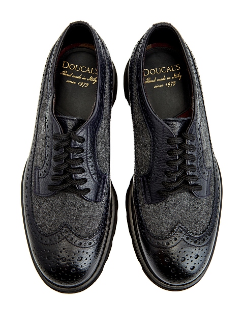 Комбинированные дерби в стиле smart casual от Doucal’s сочетают мягкую зернистую кожу и плотный твид. Брогированная отделка и шнуровка открытого типа вносят в образ неформальный штрих. Амортизирующая подошва с противоскользящим протектором обеспечивает комфорт в любых погодных условиях. Сделано в Италии.