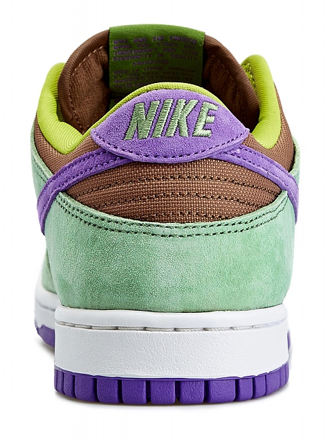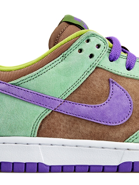 Кроссовки Nike Dunk Low SP Veneer представляют первое переиздание культовой и редкой расцветки 2001 года. В то время компания запустила новую линейку «данков» Pro B, усовершенствовав классический баскетбольный силуэт для так полюбивших его скейтбордистов, что в последствии превратилось в целое направление Nike SB. Релиз оригинальной модели проходил эксклюзивно в Японии, где бренд позволял себе эксперименты с цветами и материалами — отсюда столь эксцентричная расцветка, которая поместила кроссовки в так называемую серию Ugly Duckling — коллекцию из трех замшевых «данков» в бунтарски-контрастных цветах. Как и 20 лет назад, новая версия модели выполнены из премиальной мягкой замши в контрастных оттенках зеленого, коричневого и фиолетового, напоминая то ли Джокера, то ли Донателло из «Черепашек-ниндзя». Комфортную посадку обеспечивает нейлоновый язычок, отделка шелковистым текстилем, плотная набивка и прочная панель из сетки в области пятки. Легкая конструкция закреплена на белой подошве из пены с фиолетовой резиновой подметкой.