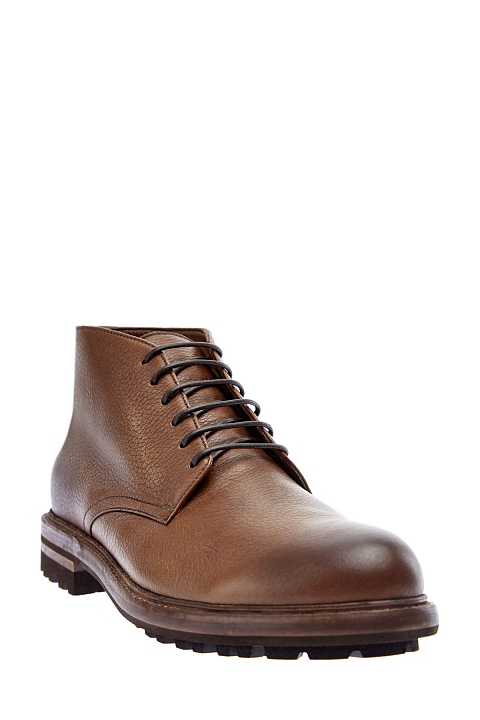 Высокие мужские ботинки от Brunello Cucinelli выполнены из мягкой и плотной оленьей кожи с бархатистой текстурой. Модель окрашена и отполирована вручную, за счет чего достигается легкий эффект патины по краям. Внутренняя подкладка из шерсти мериноса создает надежную защиту даже в условиях низких температур. Выступающий рант и подошва обработаны по особой технологии, которая придает поверхности винтажный эффект. Детали: противоскользящий протектор, длина стельки в размере 43 — 29 см. Сделано в Италии.
