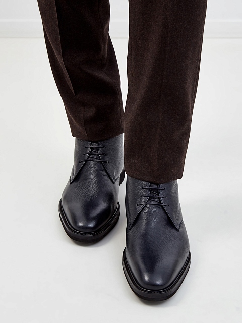 Высокие мужские ботинки-дерби ручной работы от Moreschi выполнены из крупнозернистой кожи теленка. Глубокий оттенок индиго делает модель универсальным дополнением образов в стиле casual. Подошва с фактурным рисунком протектора предотвращает скольжение, а внутренняя отделка из овчины обеспечивает максимальный комфорт даже в холодное время года. Сделано в Италии.
