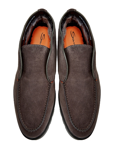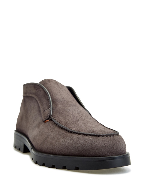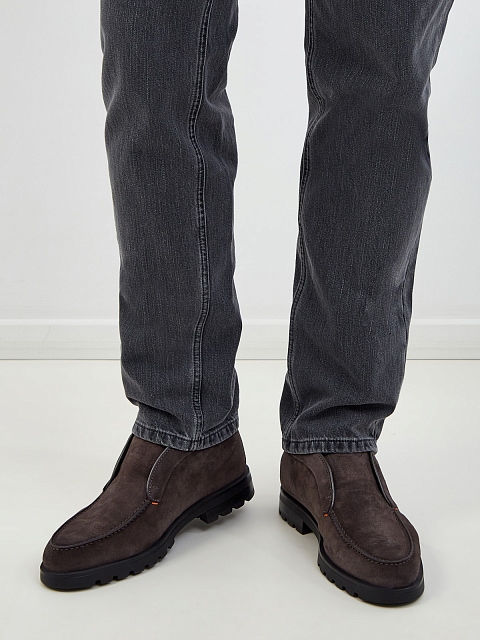 Лаконичные мужские ботинки от Santoni выполнены в приглушенном серо-табачном оттенке. Для создания модели была выбрана бархатистая замша и густой овечий мех для дополнительной защиты в условиях низких температур. Завышенные боковые панели и литая подошва из каучука делают обувь особенно актуальной в осенне-зимний сезон. Сделано в Италии.