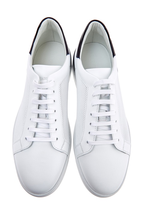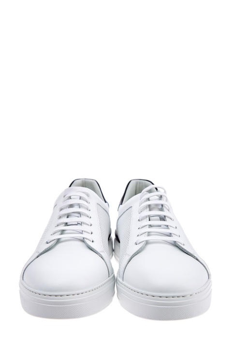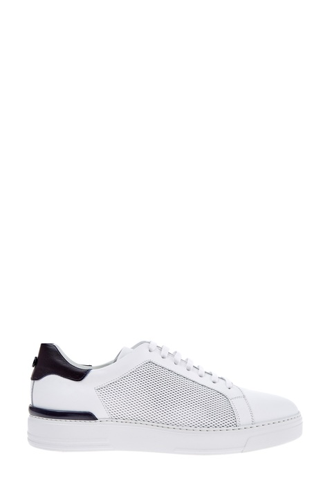 Кеды в спортивном стиле из линии Blu Barrett от Barrett выполнены из матовой кожи гладкой выделки в белоснежном цвете. Контрастные вставки черного тона и перфорированные боковые панели придают образу динамичность. Детали: массивная литая подошва со стеганым рантом, внутренняя отделка из кожи, шнуровка в тон. Сделано в Италии.