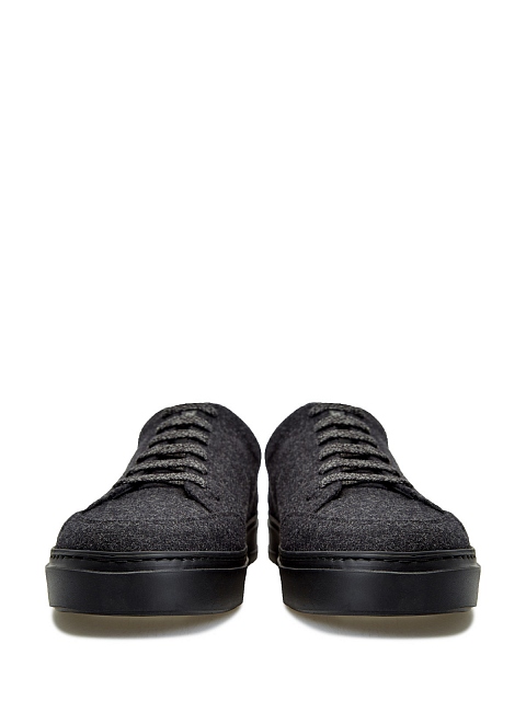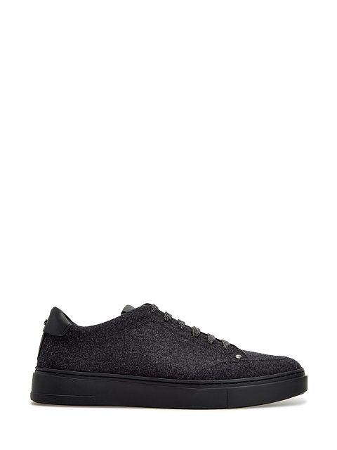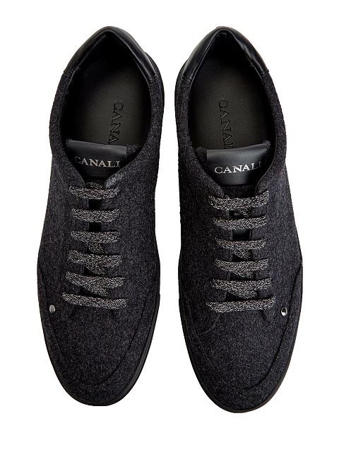 Лаконичные мужские кеды от Canali выполнены из плотной фактурной шерсти. Отделка из гладкой кожи и минималистичный дизайн делают модель универсальным дополнением повседневных образов в стиле casual. Фирменный штрих — логотип бренда на язычке и брендированные заклепки. Детали: две пары шнурков в комплекте, литая подошва в тон. Сделано в Италии.