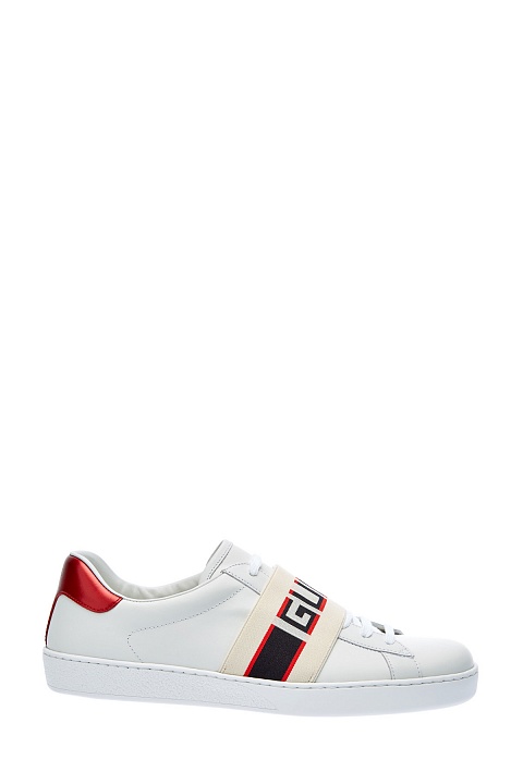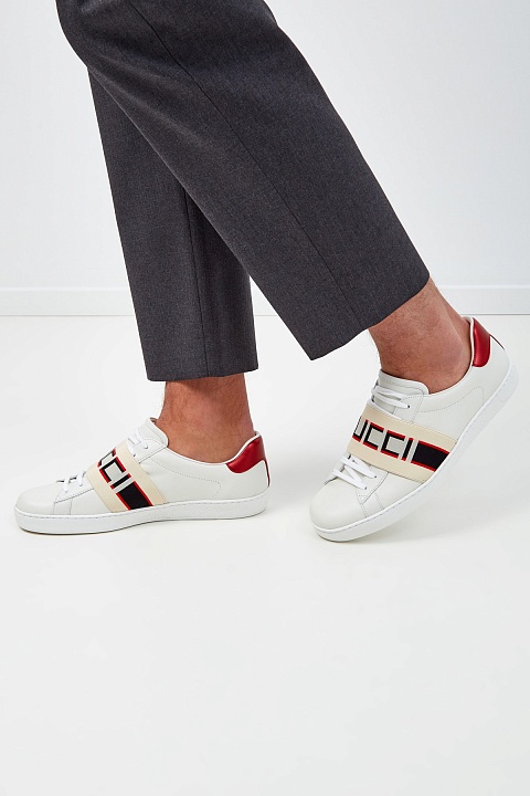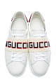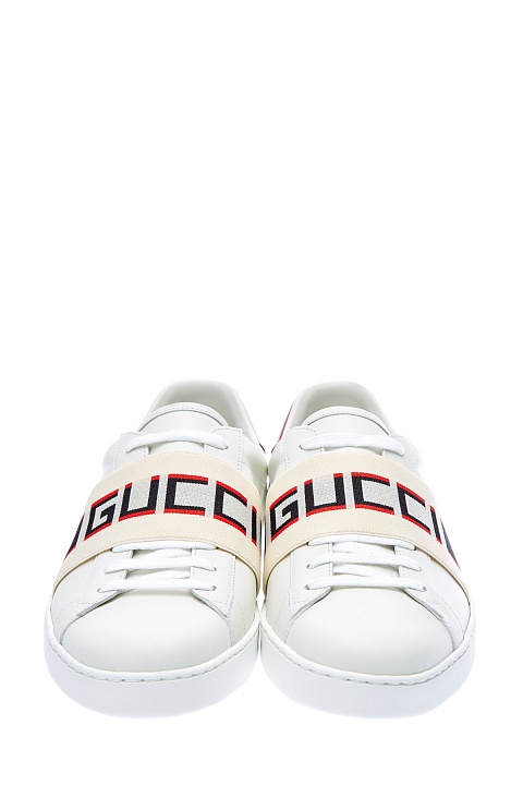 Стильные кеды от Gucci созданы из матовой мелкозернистой кожи в базовом белом цвете. Фирменный стиль подчеркивает широкая эластичная лента с жаккардовой вышивкой в виде монограммы бренда в гамме Web. Детали: закругленный мысок, вставки из металлизированной кожи, контрастная шнуровка, массивная подошва, внутренняя кожаная отделка. Длина стельки для размера 9 составляет 28 см. Сделано в Италии.