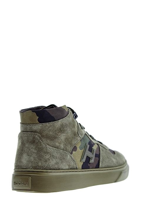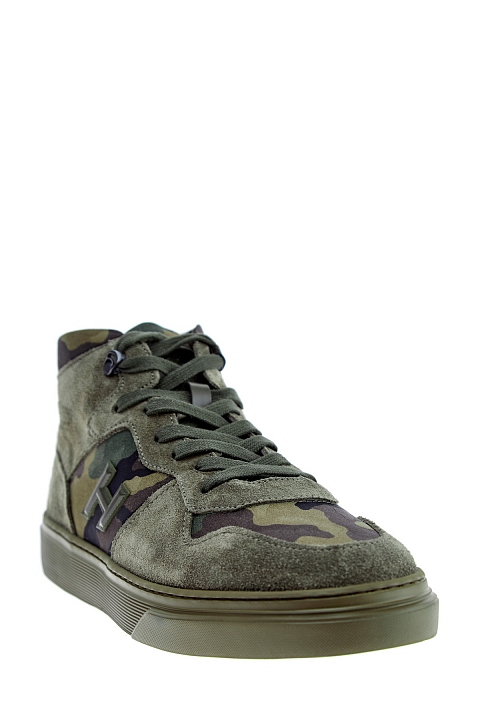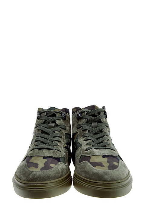Высокие мужские кеды в стиле милитари от Hogan выполнены из прочного и дышащего хлопка с камуфляжным принтом в оттенке хаки. Модель дополнена вставками из замши в тон, а также литой подошвой с рифленым рантом. Детали: отделка из кожи, объемный логотип на боковых панелях, металлические фиксаторы шнуровки.