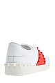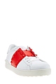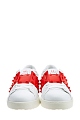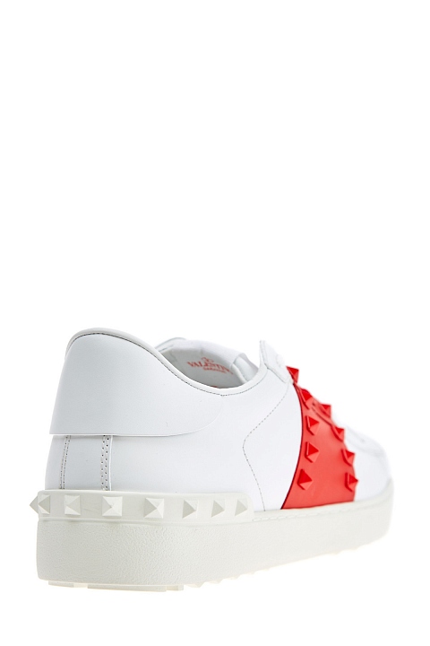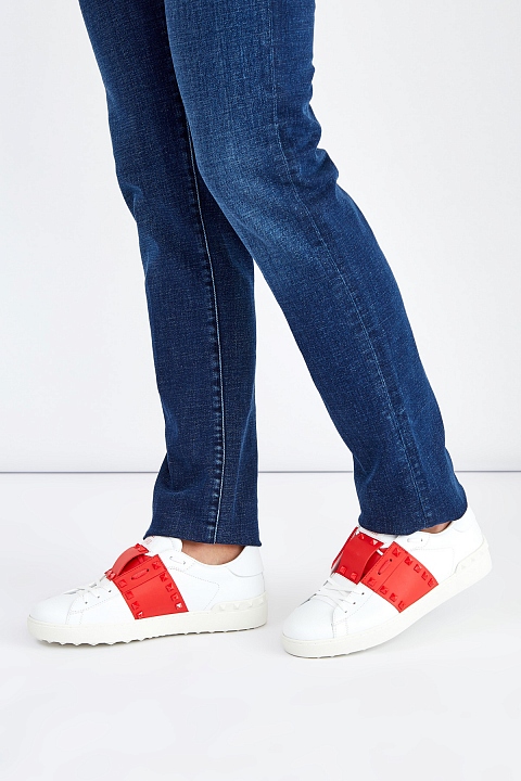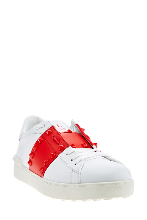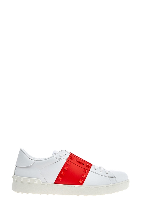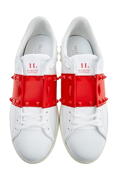 Культовые кеды от Valentino Garavani вошли в линию Rockstud Untitled под номером 11, дань истории создания воздает нашивка со знаковым числом на язычке. Модель изготовлена из гладкой кожи наппа белого цвета. Особенностью стали контрастные вставки оттенка Rosso, декор в виде заклепок-пирамид с глянцевым покрытием перекликается с объемным узором на подошве. Круглый мысок и шнуровка формируют расслабленный образ в спортивном стиле. Перфорированная дышащая стелька из кожи обеспечивает комфорт. Сделано в Италии.