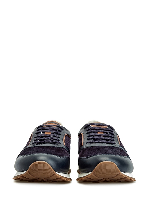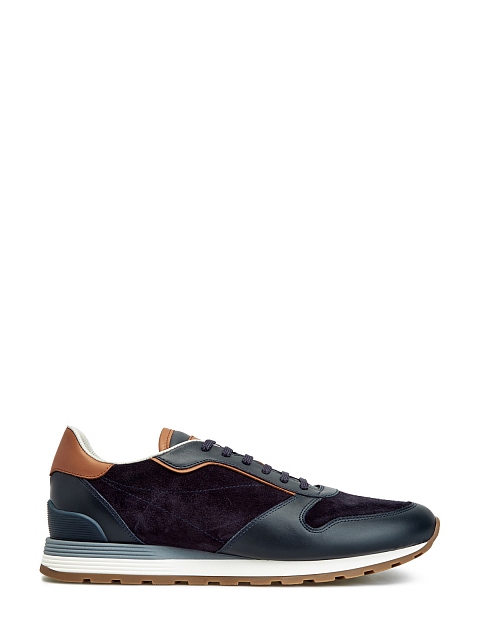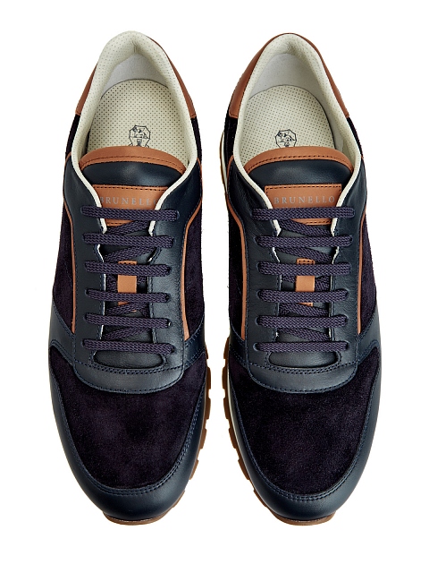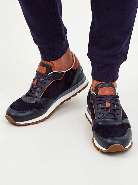 Мужские кроссовки из линии Active от Brunello Cucinelli выполнены в стиле colorblock в синих и коричневых тонах. Модель создана из натуральной замши с легким эффектом потертости, достигнутым мастерами бренда вручную, и дополнена окантовкой из телячьей кожи. Детали: гладкая внутренняя отделка, двухслойная амортизирующая подошва с рифленым протектором, логотип бренда на спинке. Сделано в Италии.
