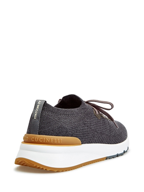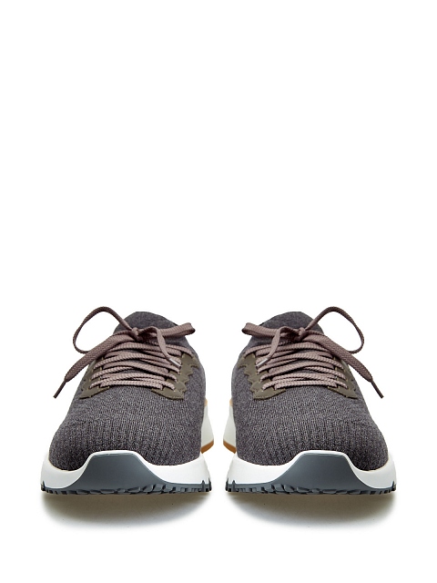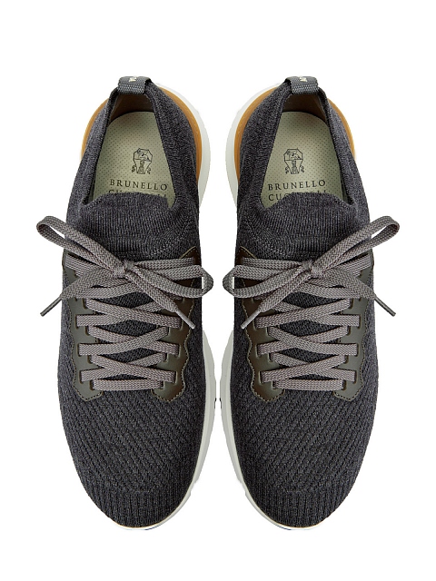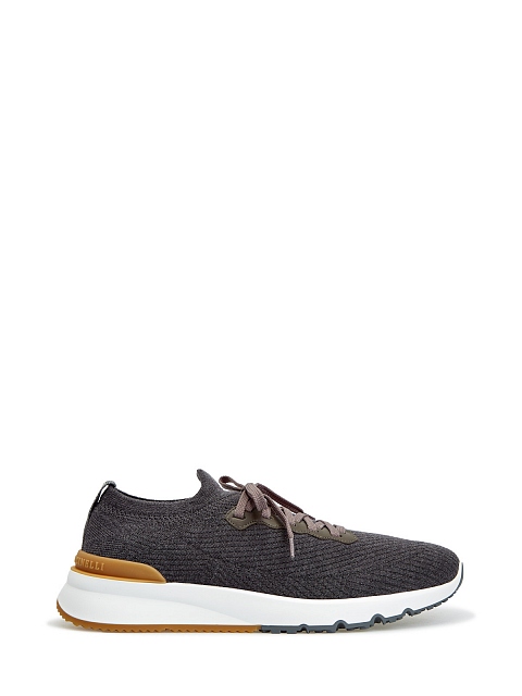 Мужские кроссовки в серой гамме от Brunello Cucinelli созданы в жаккардовой технике. Модель из эластичной шерстяной пряжи легко снимать и надевать благодаря эластичным манжетам. Протектор с рельефным узором предотвращает скольжение. Детали: отделка из телячьей кожи, эргономичная подошва. Сделано в Италии.