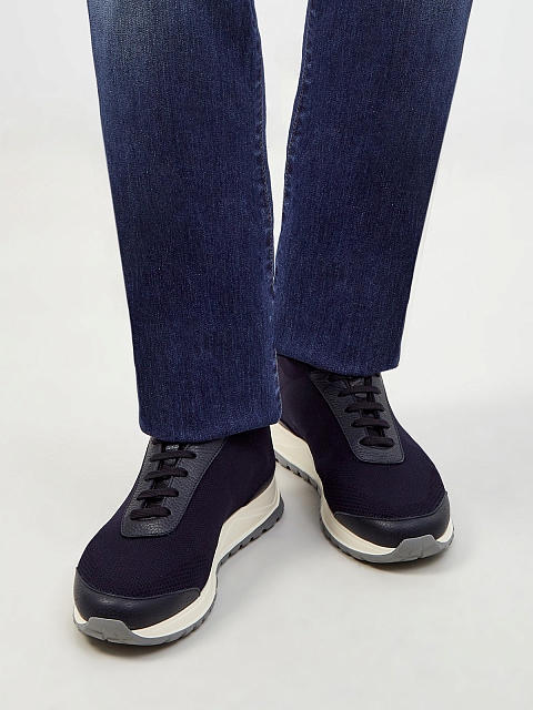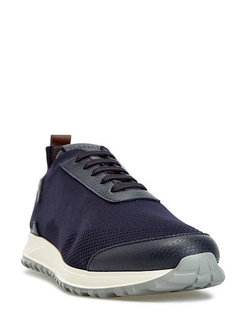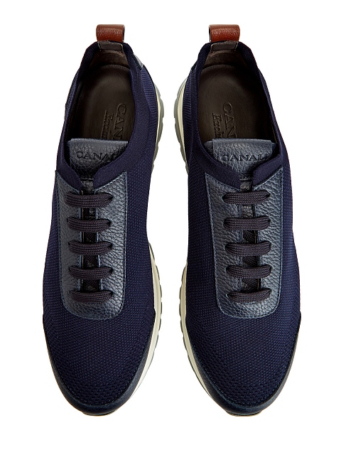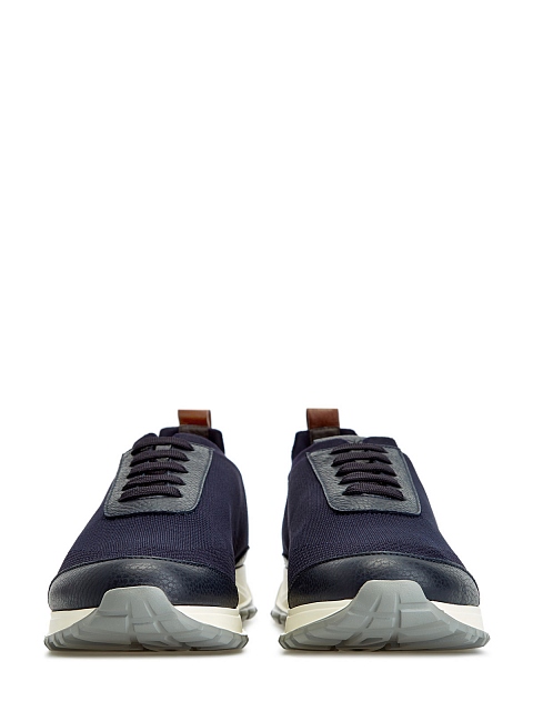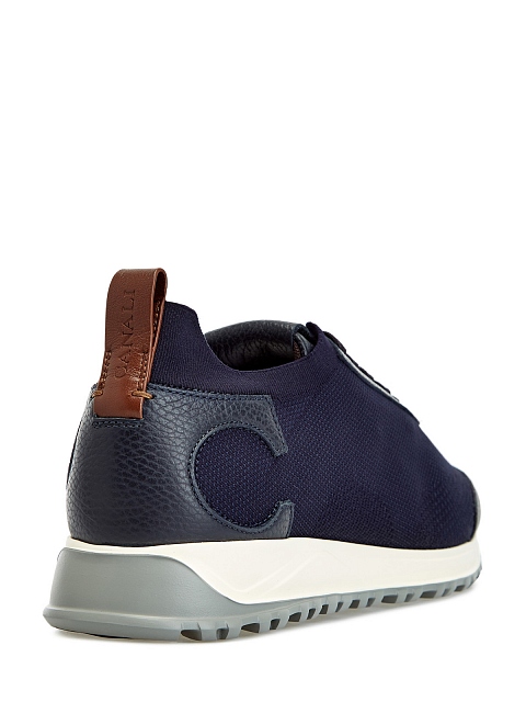 Кроссовки из линии Exclusive от Canali сочетают мягкую зернистую кожу и эластичный трикотаж с добавлением дышащего хлопка. Легкая облегающая конструкция делает посадку точной, шнуровка надежно фиксирует обувь на ноге и придает образу динамичный штрих. Контрастная нашивка из кожи с тиснением на спинке завершает дизайн. Сделано в Италии.