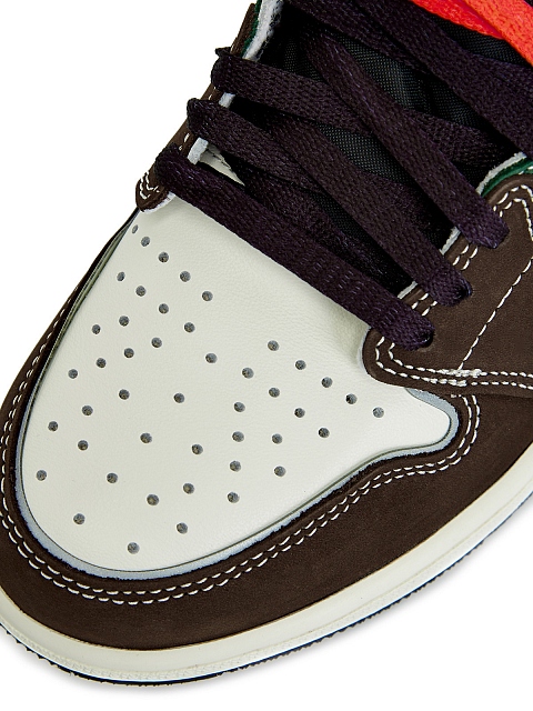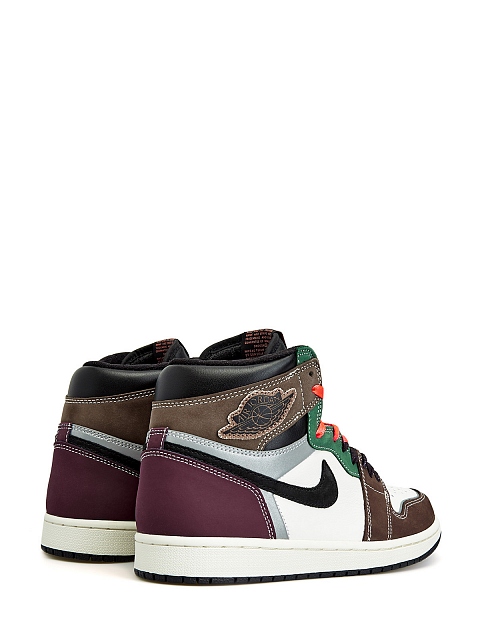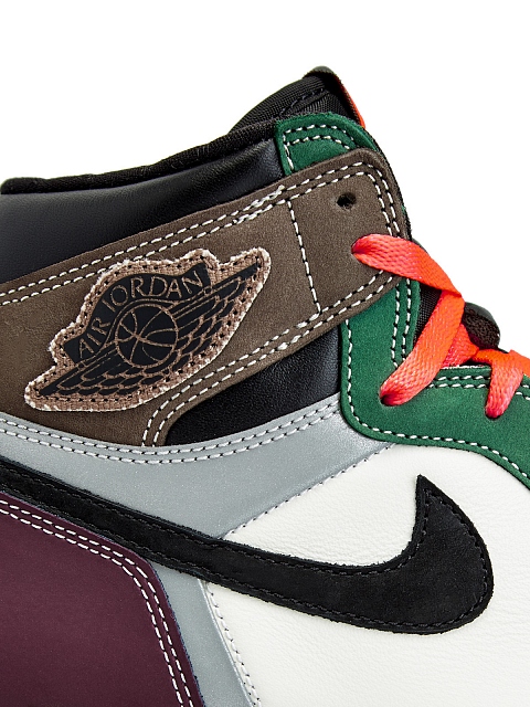 Кроссовки Jordan 1 Retro High OG Crafted представляют эклектичную версию легендарного силуэта 1985 года, со множеством деталей и насыщенной палитрой. Основная часть модели выполнена из белой кожи с обивкой нубуком в коричневом, зеленом и бордовом оттенках. Все элементы закреплены контрастными белыми швами. Логотип Swoosh по традиции изготовлен из кожи и располагается по бокам, а логотип Wings выполнен в виде глянцевого принта на канвасе, пришитом к воротничку. Пожалуй, самой неожиданной деталью стали рефлективные вставки, одна из которых едва заметно обивает контур носка, а другая имеет форму буквы Y и располагается в задней части кроссовка. В комплекте: белые и черные шнурки.