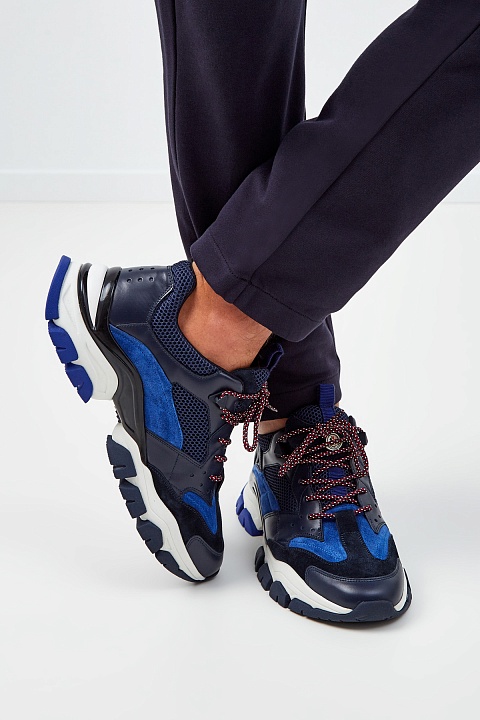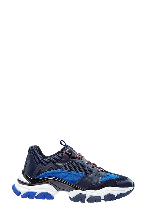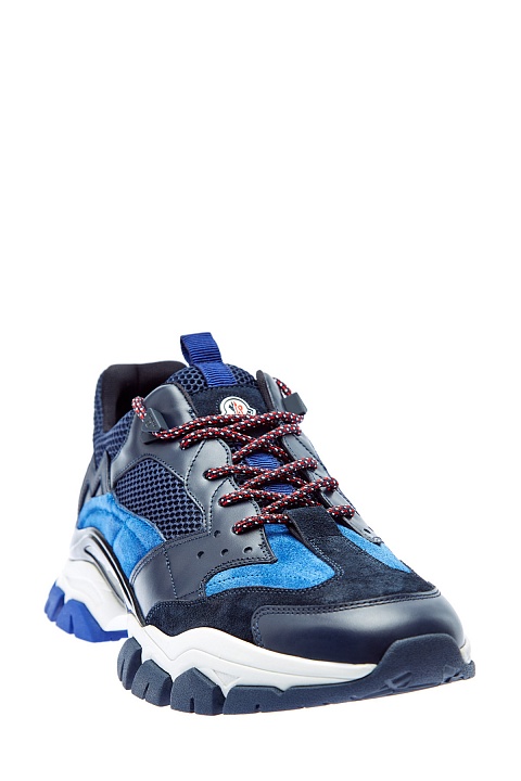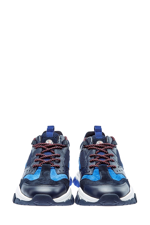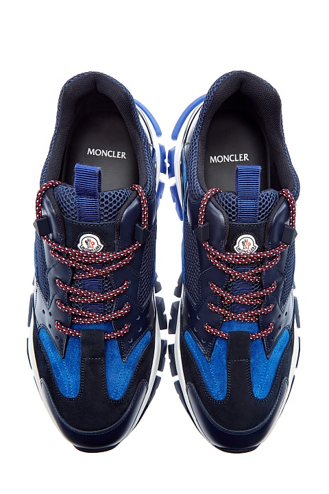 Кроссовки Leave No Trace от Moncler вдохновлены обувью для треккинга. Сегментированная амортизирующая подошва с глянцевой отделкой равномерно распределяет нагрузку, обеспечивая комфорт. Рельефный рант подчеркивают вставки в синей гамме, динамичный образ создают элементы из дышащей мембраны и телячьей кожи. Детали: символика в виде буквы «М», логотип на язычках, внутренняя отделка из кожи.